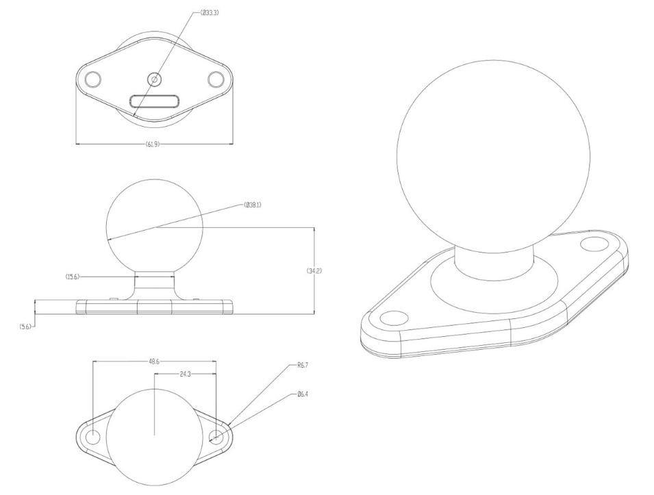 Adattatore con base diamante  62 x 33 mm con sfera C da 38,1 mm. Corpo in alluminio verniciato a polvere e sfera in gomma. Permette l'aggancio dell'asta con qualsiasi angolazione.