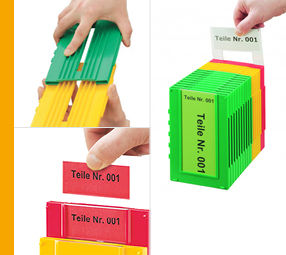 Forniti in fogli DIN A4 pre-forati possono essere stampati con qualsiasi stampante in commercio. Identificano il contenuto del Systembox. I cartoncini colorati inseriti nelle relative plastiche permettono di utilizzare un unico colore di Systembox dando la possibilità di creare il Semaforo Kanban semplicemente alternando i colori a piacimento.