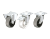 Ruota con piastra disponibile in gomma elastica, in poliammide e in poliuretano a seconda dei diametri che vanno da 100 mm a 125 mm a 160 mm, con e senza freno.